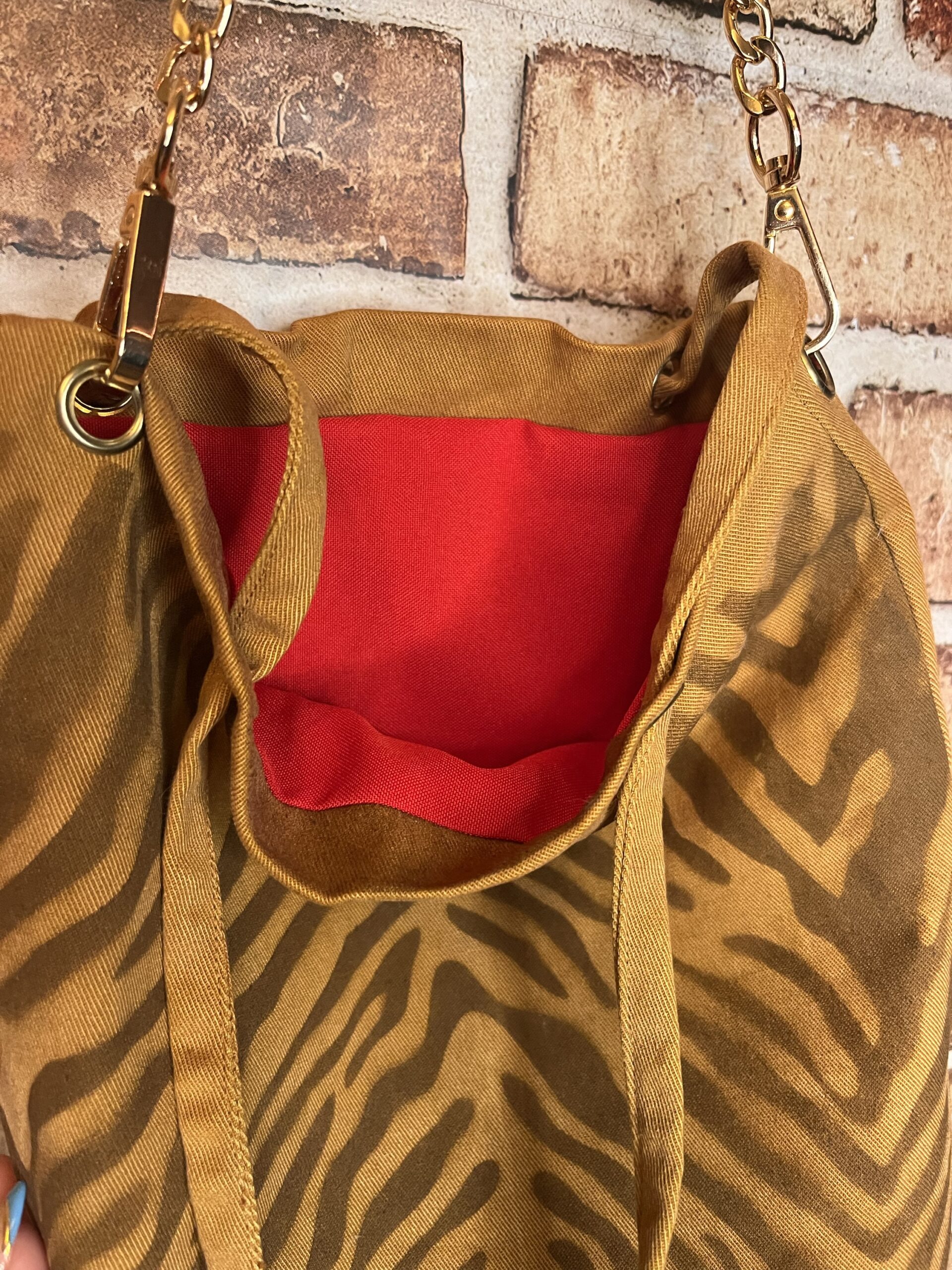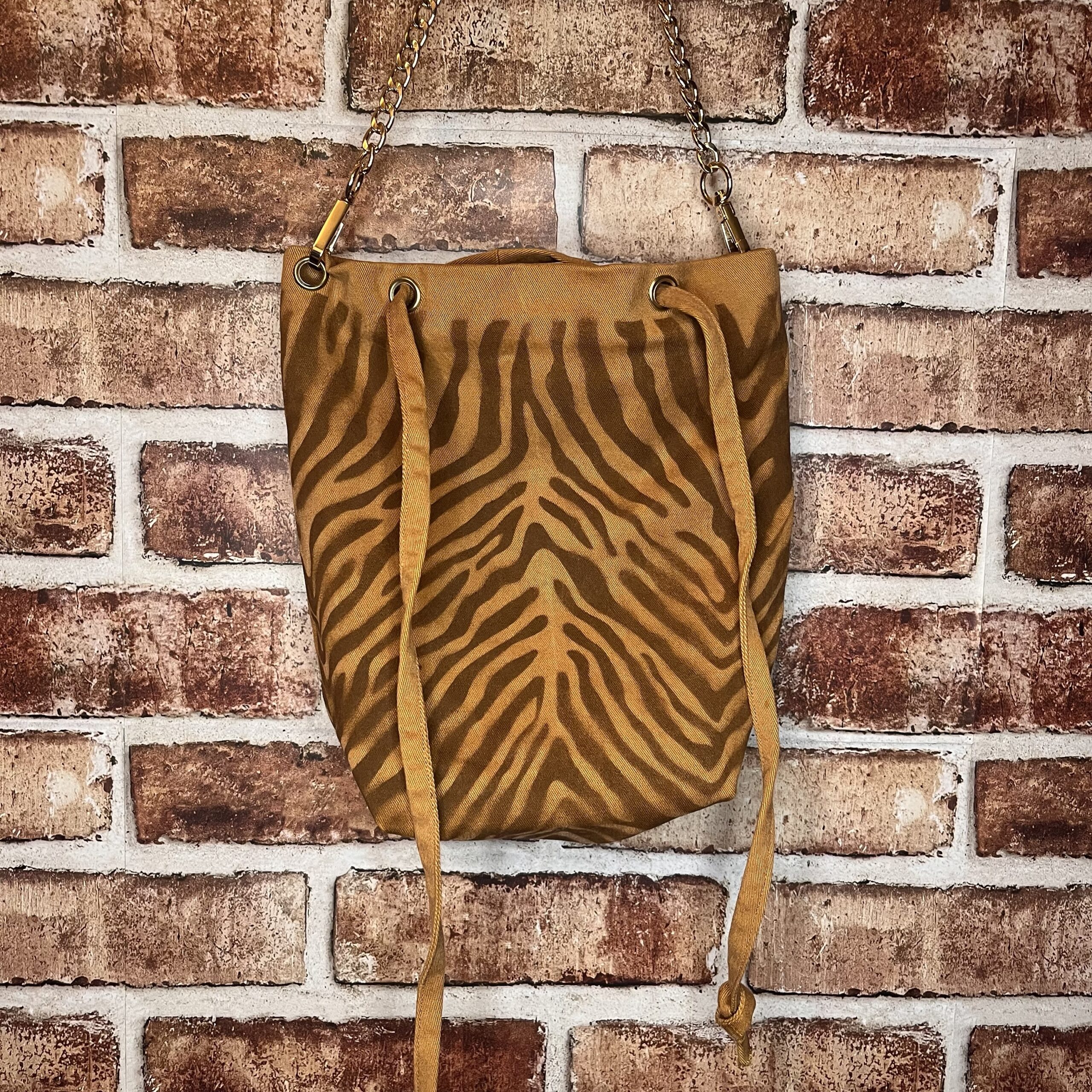 I spray painted the zebra print design on this on my fire escape one spring morning. I decided to make the interior red just like a zebra would be. I know the denim isn’t the traditional zebra color scheme, but I still think it’s cool and unique.