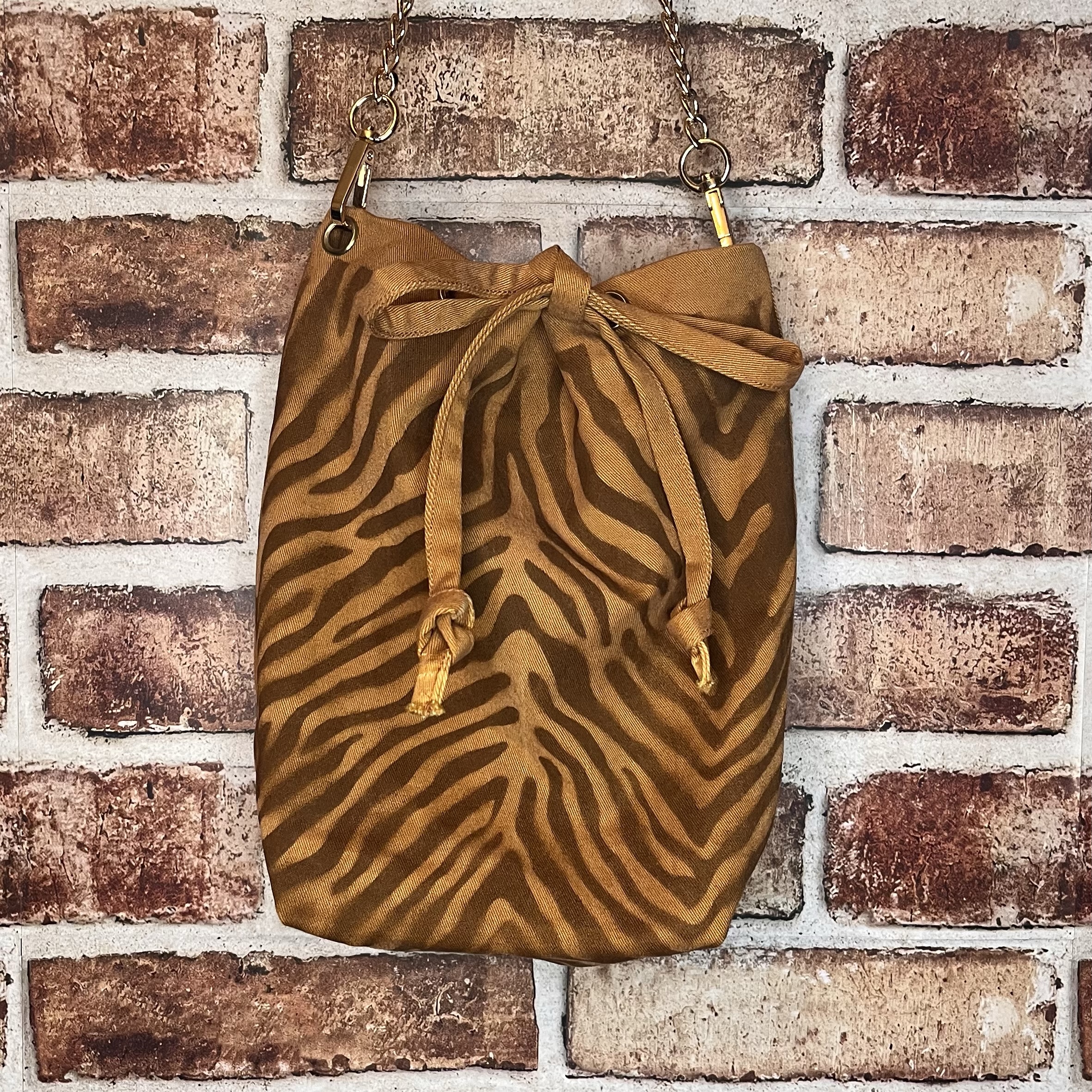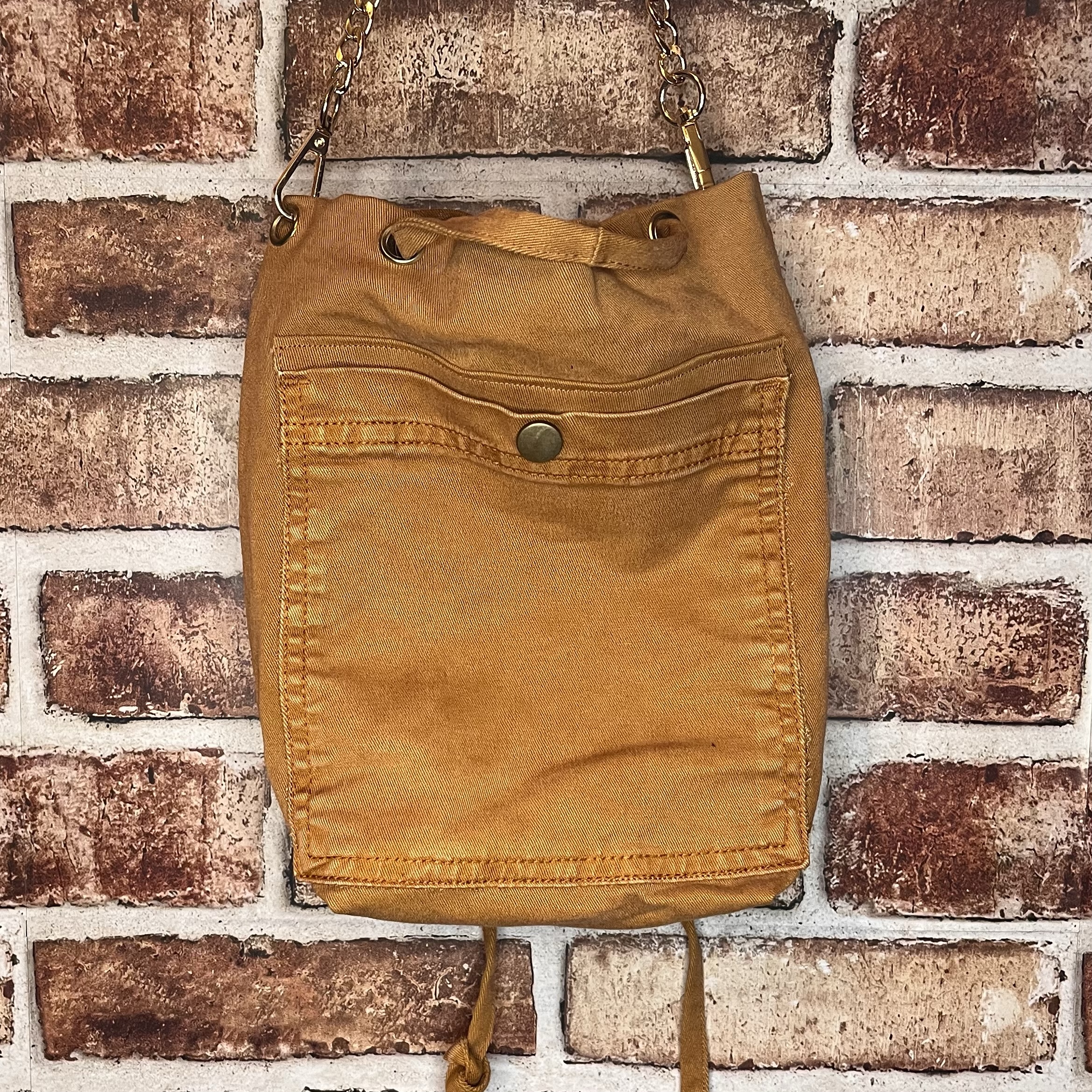 Removable gold chain strap – 46 inches long. Pocket on the back side.