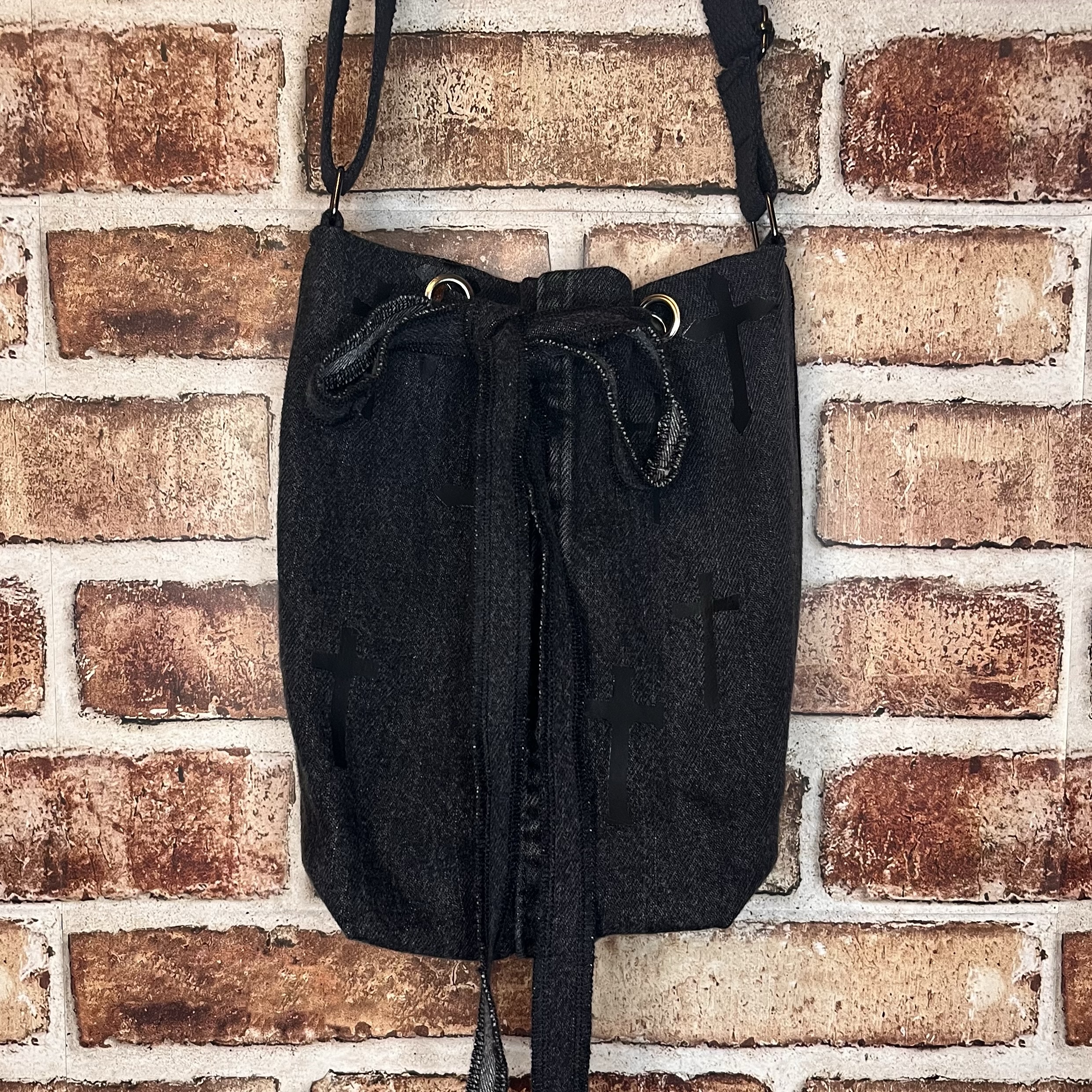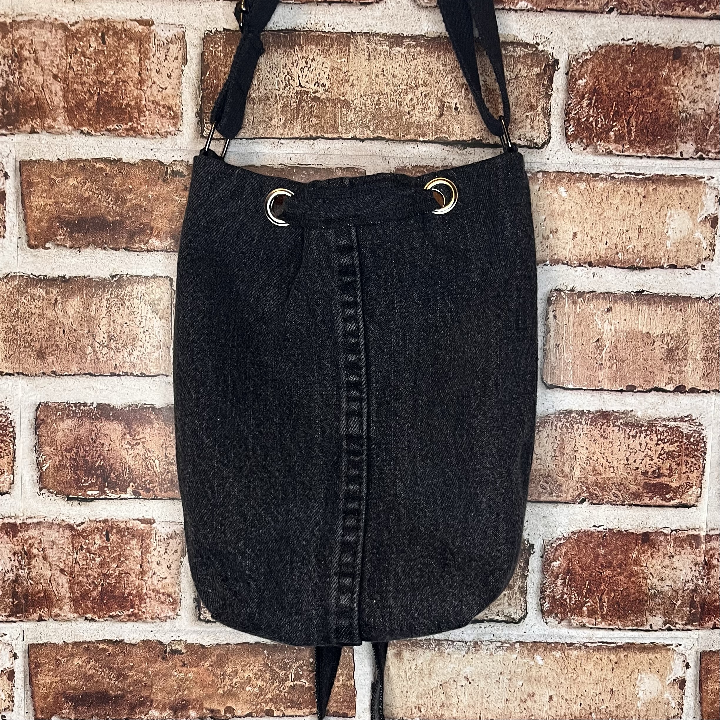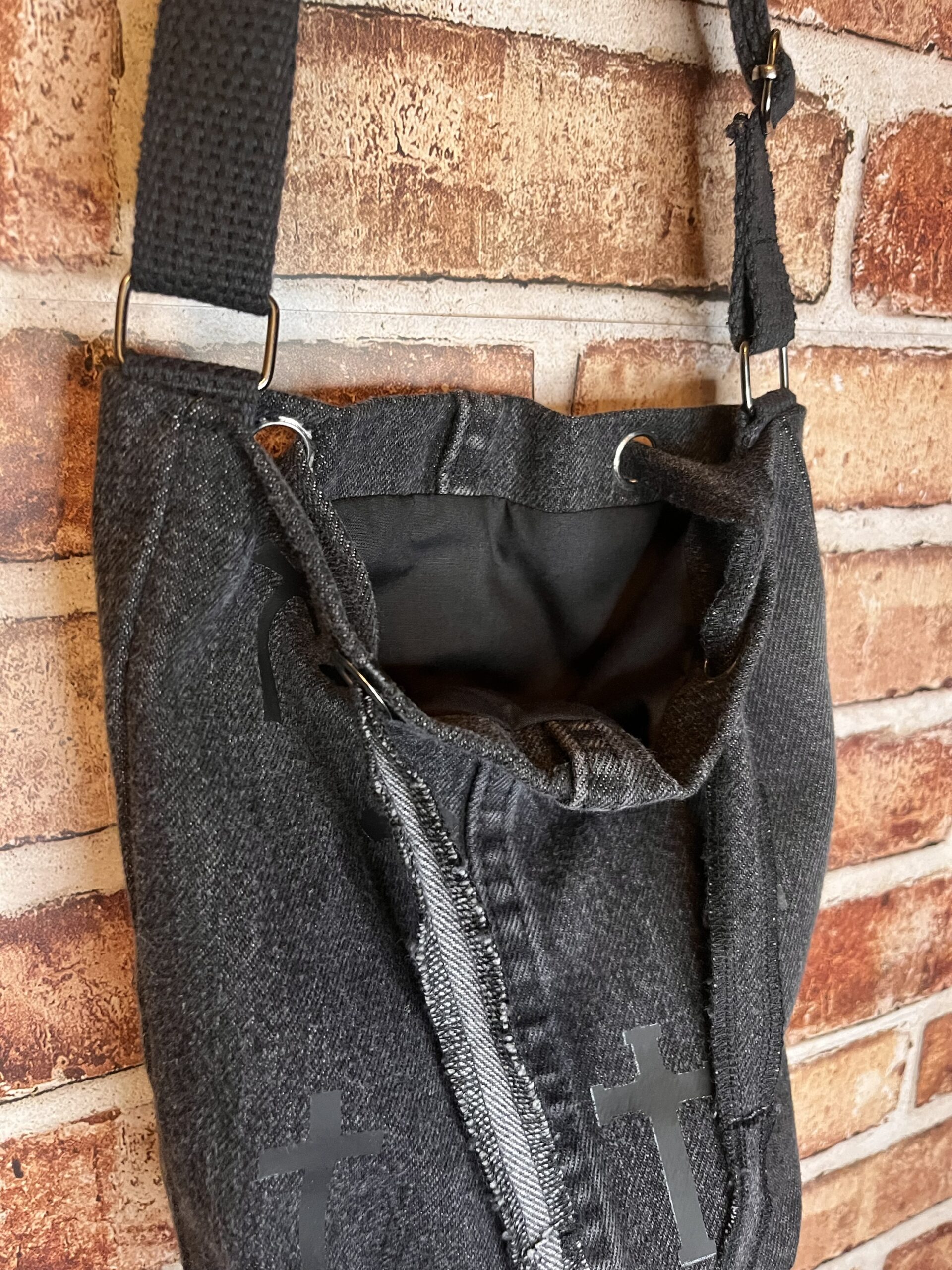 Black demin bag made from repurposed pants. Black interior. Long adjustable strap.