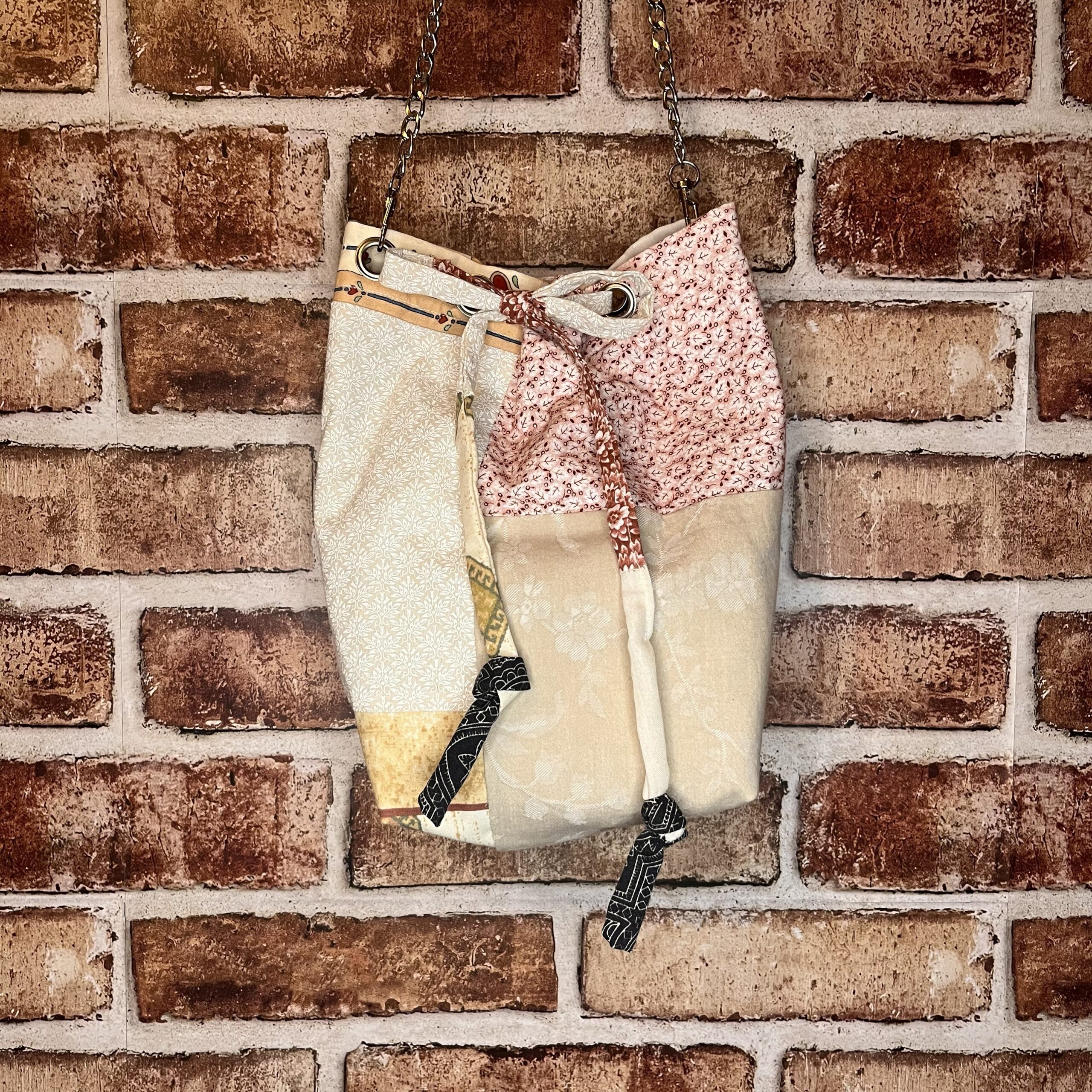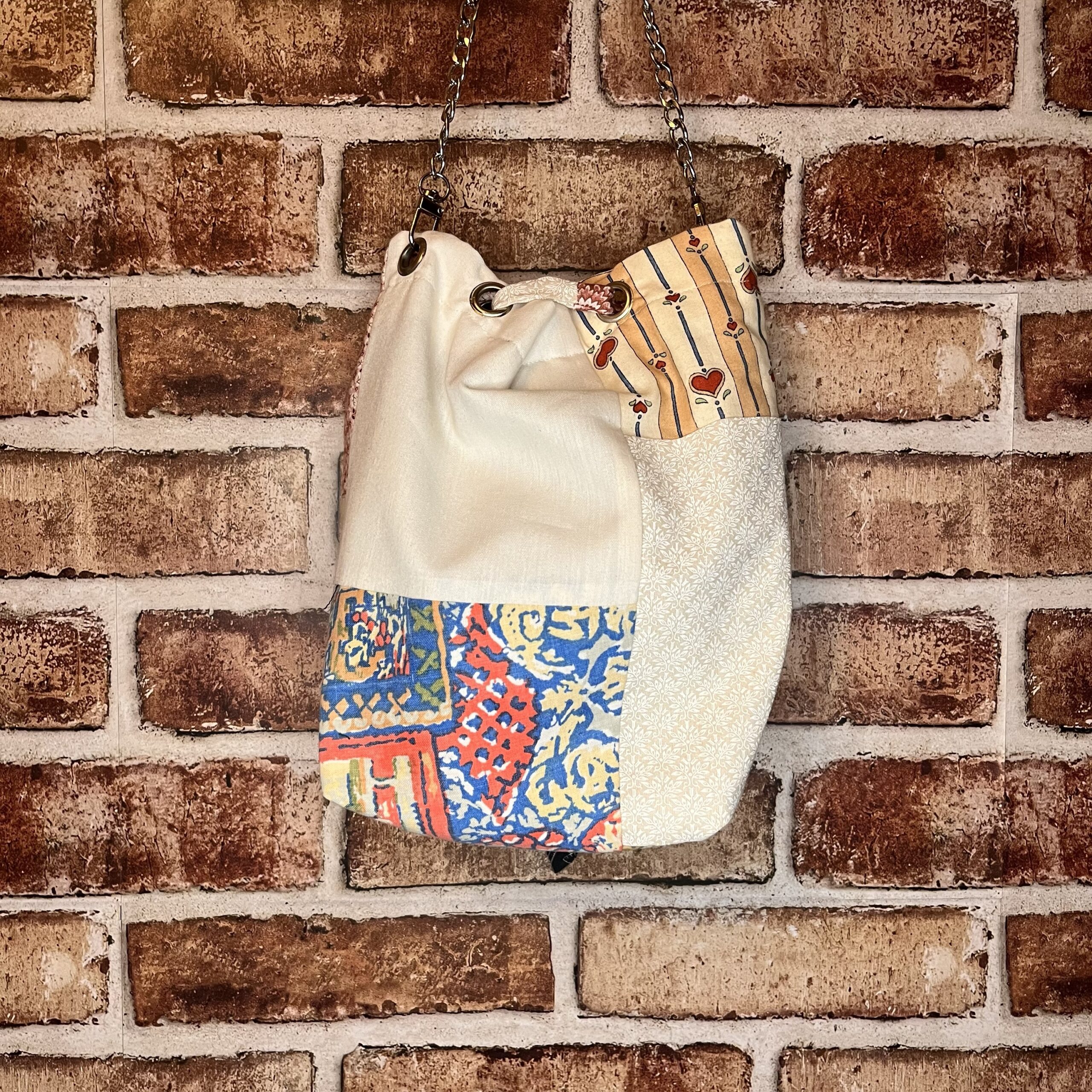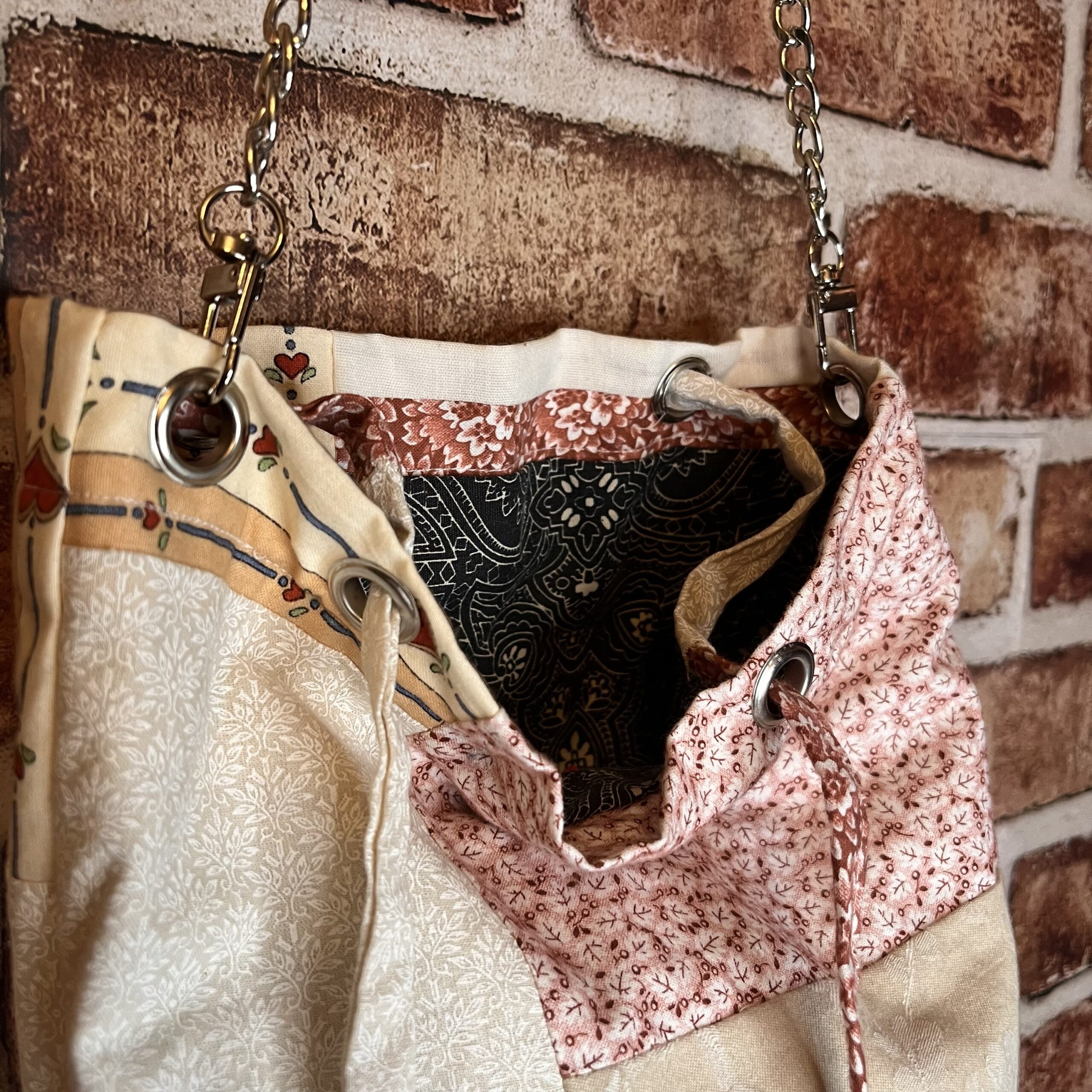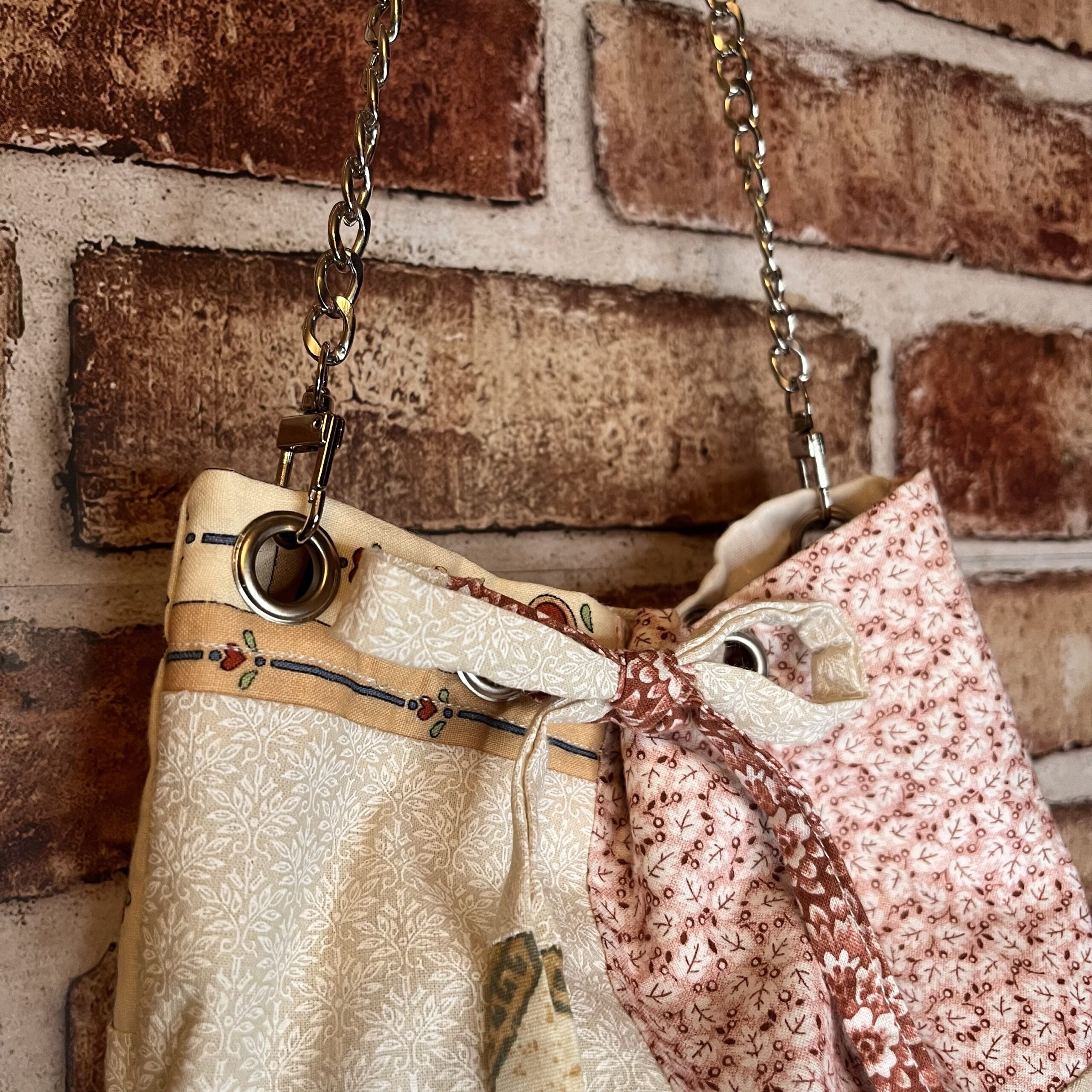This bag is made from a repurposed quilt I found at a thrift store. I thought it was too cute to pass up, so I made a few of these bags. This is the last one.