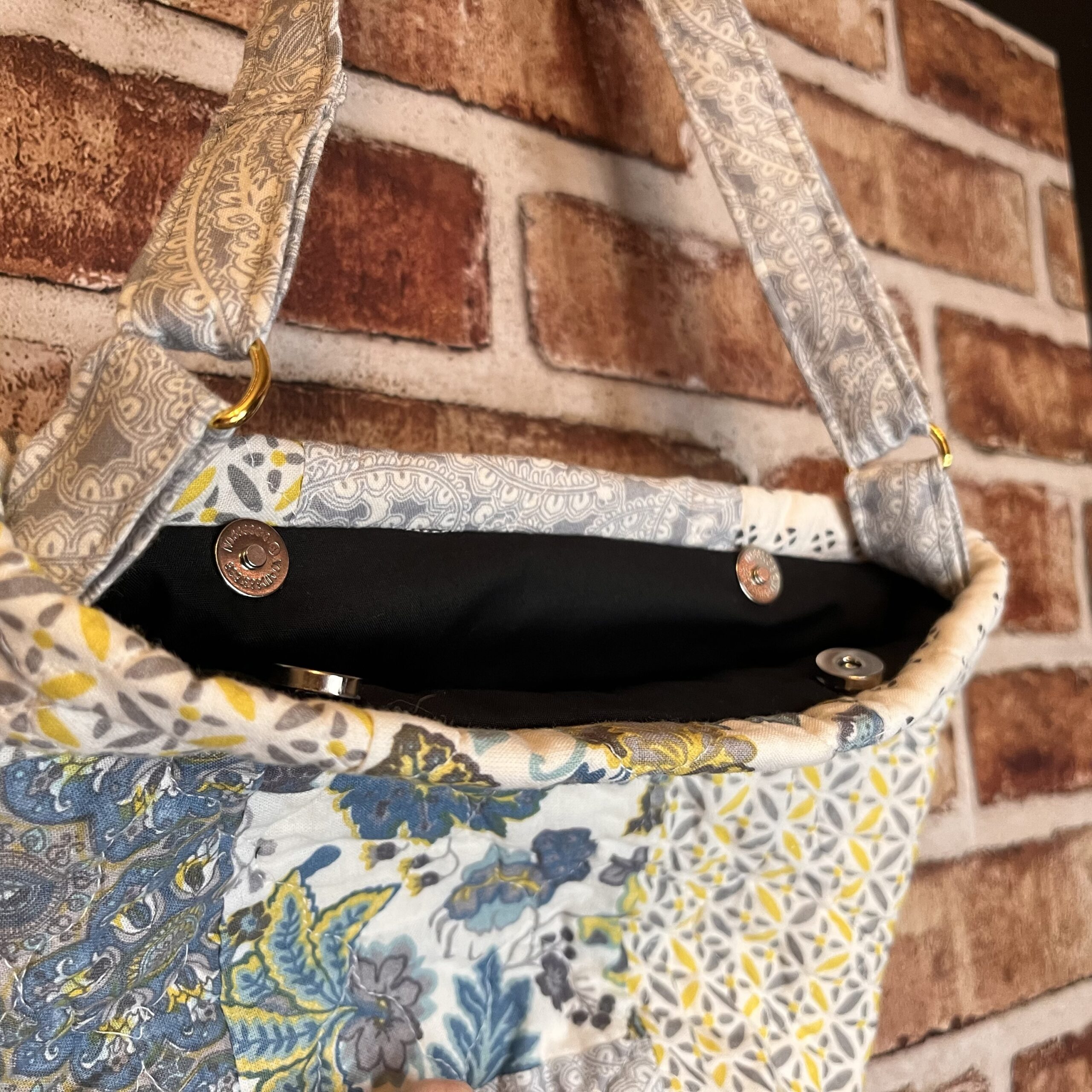 I made this one out of a repurposed quilt I found at a thrift store. Magnetic closure. Matching wallet!